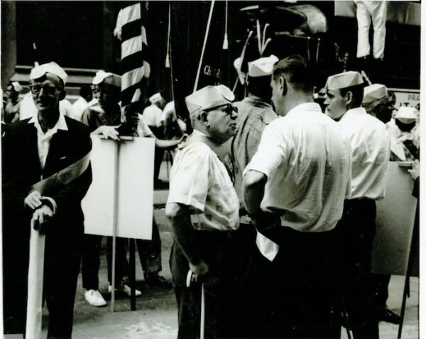 I also remember when I was about five or six that he came home with bruises and a sore shoulder. He had joined a solidarity picket line for Wall Street workers who were trying to unionize. He had been hit with a policeman’s truncheon (I have no idea what came of that action).