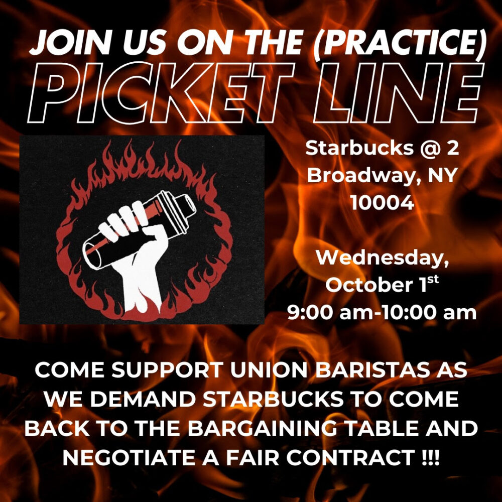 Baristas are engaging in a practice picket on Wednesday, October 1, from 9-10am at the 2 Broadway Starbucks in Manhattan. Any additional people that can turn out during this time will be immensely appreciated!
